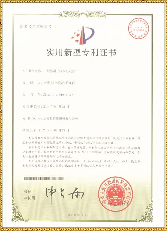 安全閥試驗(yàn)臺(tái)專利證書(shū) 蝶閥試壓臺(tái)專利證書(shū)