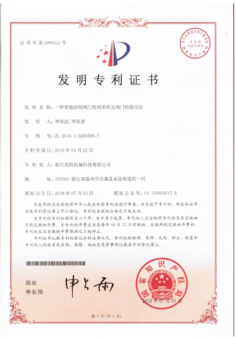 今年4月浙江優(yōu)機(jī)機(jī)械科技有限公司《一種閥門檢測(cè)設(shè)備》發(fā)明專利,獲得國(guó)家知識(shí)產(chǎn)權(quán)局授權(quán)。捷報(bào)連連該公司16年申請(qǐng)的一種智能控制閥門檢測(cè)系統(tǒng)及檢測(cè)方法已在2018年7月03日授權(quán)公告,公告號(hào):CN105954015B發(fā)明專利號(hào):ZL 2016 1 0260566.7