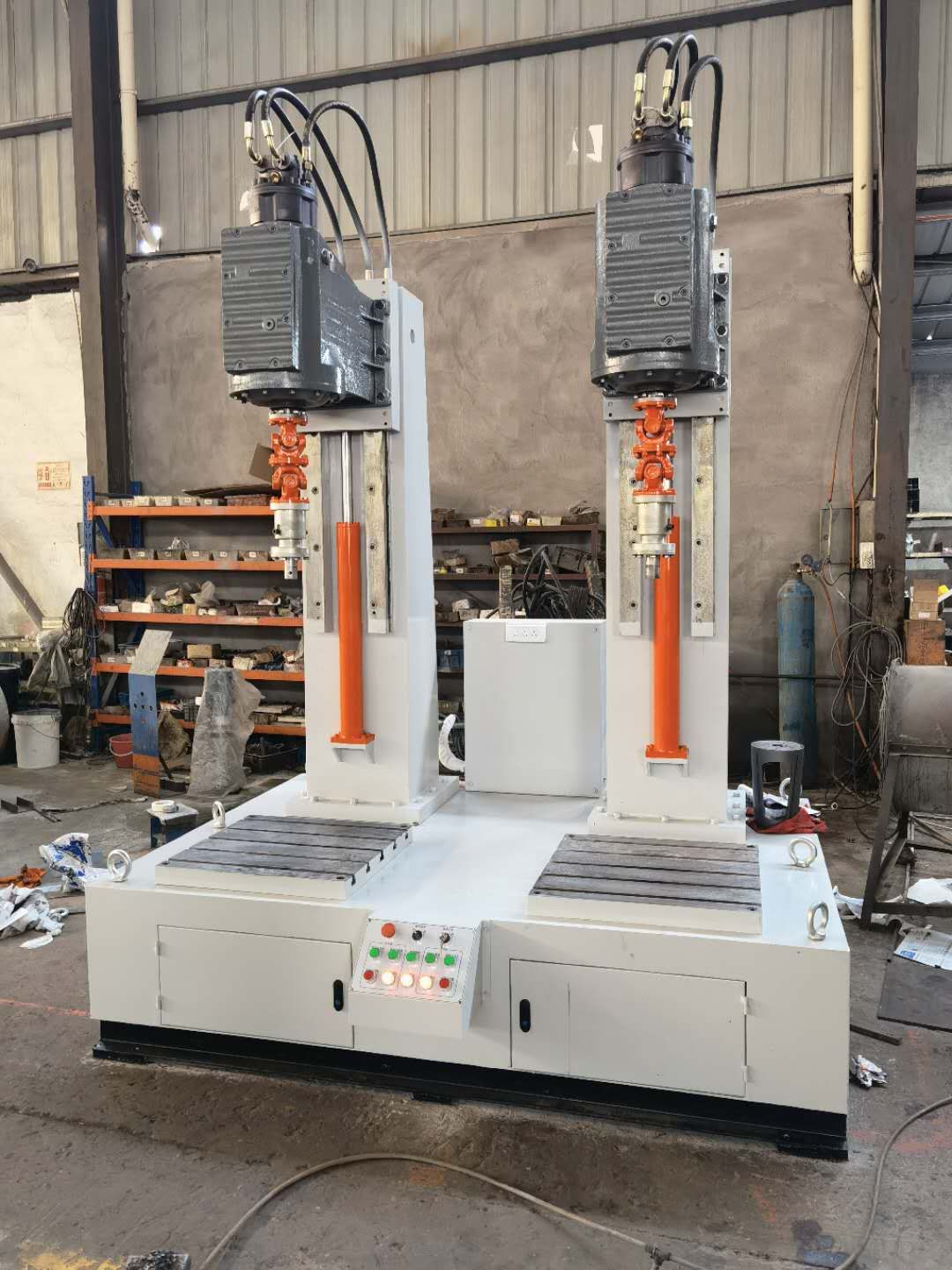 JLX型旋塞閥研磨機(jī)是針對(duì)硬密封旋塞閥密封面的研磨而精心研制的專用設(shè)備,該設(shè)備采用獨(dú)創(chuàng)的正轉(zhuǎn)360度和反轉(zhuǎn)360度,最主要的是正反轉(zhuǎn)一圈還有上下起跳5次功能方式,上下起跳功能就是解決了閥體密封面和閥芯塞密封面不會(huì)咬傷和損壞。獲得極高的加工精度、表面質(zhì)量以及批量加工的質(zhì)量一致性。JLX型旋塞閥研磨機(jī)分為一工位和兩工位研磨機(jī)、一工位研磨機(jī)和兩工位研磨機(jī)供用戶可根據(jù)要求選配。該設(shè)備通過(guò)液壓馬達(dá)來(lái)控制轉(zhuǎn)速旋轉(zhuǎn),用液壓流量來(lái)控制轉(zhuǎn)速快與慢,根據(jù)閥門口徑大小和材質(zhì)來(lái)調(diào)整轉(zhuǎn)速快慢,這樣才閥體和閥芯塞配合度為一致。用戶根據(jù)被研磨閥體的工藝要求,選擇合適的研磨劑,粗磨和精磨相結(jié)合,或閥體與閥芯塞浮動(dòng)對(duì)磨。研磨頭通過(guò)液壓油缸來(lái)上升下降來(lái)實(shí)現(xiàn)。齒輪箱與主軸采用萬(wàn)向節(jié)與伸縮桿鏈接,旋塞閥閥體和閥芯塞的垂直通過(guò)萬(wàn)向節(jié)來(lái)變動(dòng),閥體和閥芯塞用伸縮桿來(lái)控制密封面的輕重來(lái)實(shí)現(xiàn)。裝夾誤差或其它工藝誤差。研磨劑根據(jù)用戶來(lái)選擇。JLX型旋塞閥研磨機(jī)由立柱機(jī)架、導(dǎo)軌及升降機(jī)構(gòu)、齒輪箱旋轉(zhuǎn)機(jī)構(gòu)、裝夾機(jī)構(gòu)等組成,旋轉(zhuǎn)機(jī)構(gòu)的旋轉(zhuǎn)中心線相互垂直。立柱與齒輪箱底板的升降功能通過(guò)液壓油缸來(lái)實(shí)現(xiàn),通過(guò)按鈕可進(jìn)行上升或下降。