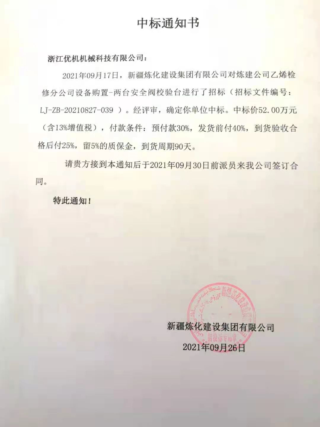 近期,新疆煉化建設(shè)集團(tuán)有限公司發(fā)出中標(biāo)通知書,宣布通知浙江優(yōu)機(jī)機(jī)械科技有限公司,二次添加設(shè)備購置項(xiàng)目-兩套安全閥校驗(yàn)臺,經(jīng)評審確定中標(biāo)(招標(biāo)文件編號:LJ-ZB-20210827-039),合計(jì)一期和二期閥門檢測校驗(yàn)設(shè)備總數(shù)達(dá)到11臺(套)金額貳佰多萬,該項(xiàng)目是浙江優(yōu)機(jī)機(jī)械科技有限公司主營產(chǎn)品進(jìn)入中石油樣本項(xiàng)目。