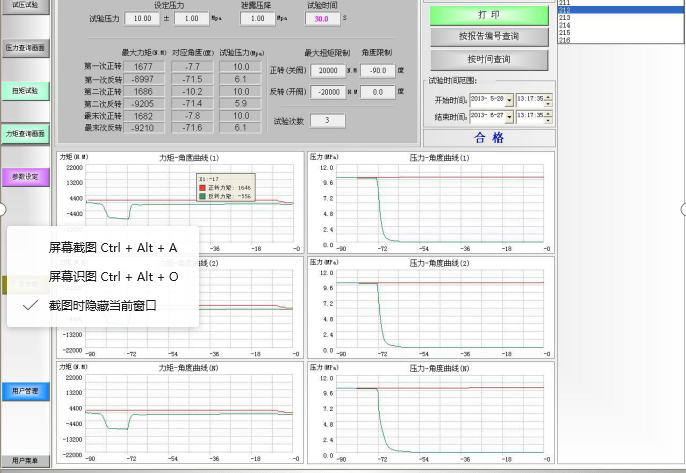3、在進(jìn)行閥門”啟閉扭矩測試”時,該裝置以液壓能為動力,液壓馬達(dá)產(chǎn)生可控可調(diào)的扭矩,通過扭矩傳感器和萬向節(jié)傳動桿,將扭矩傳至被測閥門,在被測閥門帶壓關(guān)閉或帶壓開啟時,啟閉閥門的扭矩由扭矩傳感器檢出信號,傳至“觸摸屏監(jiān)測系統(tǒng)”,系統(tǒng)實時地將檢測全過程的扭矩值,以曲線的形式,顯示和儲存在系統(tǒng)中,同時在系統(tǒng)中顯示最大的扭矩力,通過關(guān)鍵字,可檢索、查閱和打印扭矩檢測的數(shù)據(jù)和曲線。